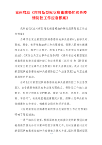 我州启动应对新型冠状病毒感染的肺炎疫情防控工作应急预案,确保各项防控措施有效落实。下面是网友整理分享的我州启动《应对新型冠状病毒感染的肺炎疫情防控工作应急预案》相关资料,供大家学习参考,喜欢就分享吧!