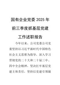 国有企业党委持续强化基层党建工作,提升组织力,推进党建与业务深度融合,确保各项任务落实到位。公文包网友为您分享整理的“(整理)国有企业党委2025年前三季度抓基层党建工作述职报告”范文资料,以供您参考学习之用,希望喜欢。
