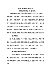学校课后服务结合作业辅导与兴趣社团活动,丰富学生课外生活,提升学习兴趣,促进全面发展。公文包网友为您分享整理的“作业辅导+兴趣社团——学校课后服务工作总结”范文资料,以供您参考学习之用,希望喜欢。
