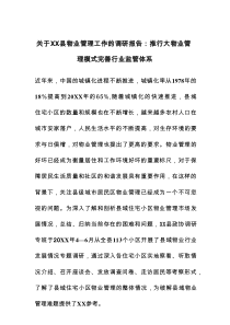 调研显示,推行大物业管理模式有助于完善行业监管体系,提升服务质量,促进社区和谐。以下由网友整理分享的关于XX县物业管理工作的调研报告:推行大物业管理模式完善行业监管体系相关文档,供您学习参考,喜欢就分享吧!