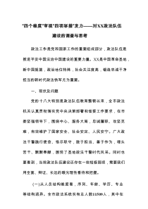 从思想、组织、作风、能力四个维度审视,通过教育引导、制度建设、监督考核、激励保障四项举措发力,推动政法队伍建设取得新进展。公文包网友为您分享整理的““四个维度”审视 “四项举措”发力——对XX政法队伍建设的调查与思考”范文资料,以供您参考学习之用,希望喜欢。