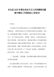 强调加强作风建设与反腐斗争,确保措施落实到位,提升群众满意度,如何有效推进?下面是小编为您整理的在全县2025年群众身边不正之风和腐败问题集中整治工作推进会上的讲话范例,仅供参考,希望对您有所帮助。