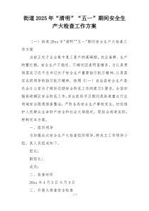 街道将组织全面安全生产大检查,覆盖清明五一期间,确保隐患排查整治到位,保障居民安全!下面网友分享多篇相关内容供您参考学习,希望有您喜欢的。