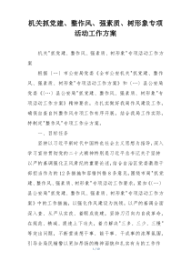 机关通过加强党的建设、整顿工作作风、提升人员素质、树立良好形象,推动整体工作水平提高。下面是小编为您整理的机关抓党建、整作风、强素质、树形象专项活动工作方案范例,仅供参考,希望对您有所帮助。