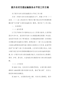 加强农村交通基础设施建设,优化运输服务网络,提升服务质量与效率,确保安全便捷出行。下面是小编为您整理的提升农村交通运输服务水平的工作方案范例,仅供参考,希望对您有所帮助。
