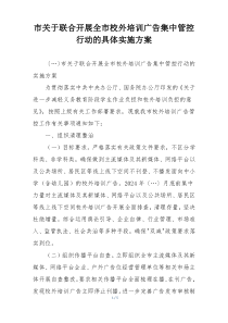 市联合开展校外培训广告集中管控行动,明确职责分工,加强巡查监管,严格执法处罚,确保行动实效。公文包网友为您分享整理的“市关于联合开展全市校外培训广告集中管控行动的具体实施方案”范文资料,以供您参考学习之用,希望喜欢。