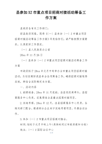 为确保县参加XZ市重点项目招商对接活动顺利进行,需提前制定详细方案,明确分工,加强沟通协调,确保各项准备工作落实到位。公文包网友为您分享整理的“县参加XZ市重点项目招商对接活动筹备工作方案”范文资料,以供您参考学习之用,希望喜欢。