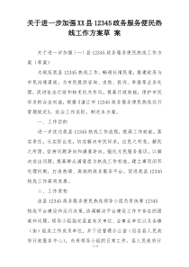 为提升XX县12345政务服务便民热线效能,优化服务流程,强化人员培训,确保群众诉求及时响应解决。下面是网友整理分享的关于进一步加强XX县12345政务服务便民热线工作方案草 案相关资料,供大家学习参考,喜欢就分享吧!