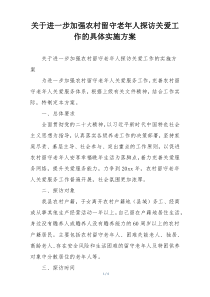 加强农村留守老年人探访关爱工作需完善服务体系,建立探访制度,强化社会参与,提升服务质量。下面是小编为您整理的关于进一步加强农村留守老年人探访关爱工作的具体实施方案范例,仅供参考,希望对您有所帮助。