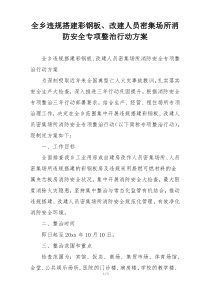 针对全乡违规搭建彩钢板及改建人员密集场所问题,开展消防安全专项整治行动,消除隐患,确保安全。以下由网友整理分享的全乡违规搭建彩钢板、改建人员密集场所消防安全专项整治行动方案相关文档,供您学习参考,喜欢就分享吧!