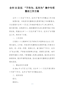 为解决全市XX队伍中存在的不作为、乱作为问题,制定专项整治方案,明确目标,细化措施,强化监督,确保整改到位。下面是小编为您整理的全市XX队伍 “不作为、乱作为”集中专项整治工作方案范例,仅供参考,希望对您有所帮助。