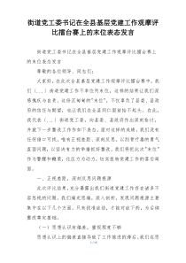 街道党工委书记在全县基层党建工作观摩评比擂台赛上表示,将认真反思不足,积极改进工作,争取早日提升排名,如何实现这一目标?以下是阿拉网友分享的“街道党工委书记在全县基层党建工作观摩评比擂台赛上的末位表态发言”,供您学习参考,希望有所用途!