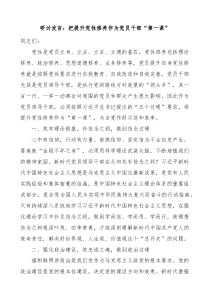 提升党性修养是党员干部首要任务,需深入学习,坚定信念,严于律己,践行宗旨,为人民服务!下面是小编为您整理的把提升党性修养作为党员干部第一课学习心得体会研讨发言材料讲话范例,仅供参考,希望对您有所帮助。
