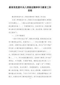 教育局党委深入学习中央八项规定精神,强化作风建设,提升工作效率,促进廉洁自律,成效如何?下面是网友整理分享的教育局党委中央八项规定精神学习教育工作总结相关资料,供大家学习参考,喜欢就分享吧!