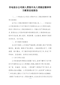 市电信分公司全面落实中央八项规定精神,加强学习教育,作风建设显著提升,纪律意识深入人心!下面是小编为您整理的市电信分公司深入贯彻中央八项规定精神学习教育总结报告范例,仅供参考,希望对您有所帮助。