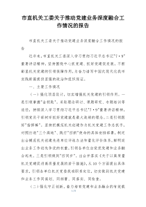市直机关工委通过创新机制、强化培训、深化服务等措施,有效促进了党建与业务工作的深度融合。以下由网友整理分享的“市直机关工委关于推动党建业务深度融合工作情况的报告”相关材料,便您学习参考,喜欢就分享给朋友吧!