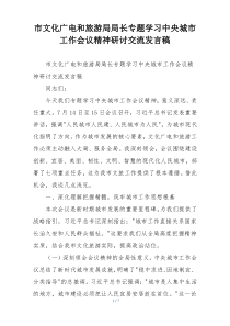 深入学习中央城市工作会议精神,探讨文旅融合发展新路径,如何更好地促进城市文化繁荣与旅游发展?下面是网友整理编辑的市文化广电和旅游局局长专题学习中央城市工作会议精神研讨交流发言稿相关范文,供大家参考学习,喜欢就下载支持!