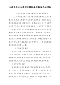 市政协深入学习中央八项规定精神,强化作风建设,提升工作效率,增强服务意识,取得显著成效。下面是小编为您整理的市政协中央八项规定精神学习教育总结报告范例,仅供参考,希望对您有所帮助。