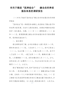 市推进医养结合模式,完善农村养老服务设施,提升老年人生活质量,促进社会和谐发展。以下是小编为您整理分享的“市关于推进“医养结合” 健全农村养老服务体系的调研报告”相关内容,供您学习参考!
