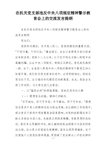 深入学习规定精神,剖析典型案例,强化纪律意识,筑牢思想防线,确保风清气正!以下由网友整理分享的“在机关党支部违反中央八项规定精神警示教育会上的交流发言提纲”相关材料,便您学习参考,喜欢就分享给朋友吧!