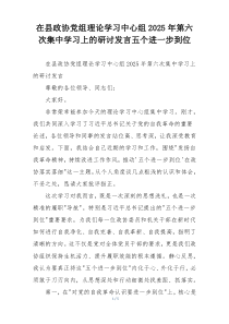 深入学习领会精神,进一步提升理论水平、增强履职能力、强化责任担当、推动工作落实、促进创新发展。以下由网友整理分享的“在县政协党组理论学习中心组2025年第六次集中学习上的研讨发言五个进一步到位”相关材料,便您学习参考,喜欢就分享给朋友吧!