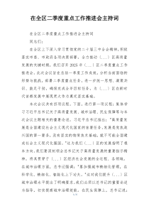 会议总结了上阶段工作成果,部署了下阶段重点任务,强调各部门要紧密协作,确保目标顺利实现。以下是阿拉网友分享的“在全区二季度重点工作推进会主持词”,供您学习参考,希望有所用途!