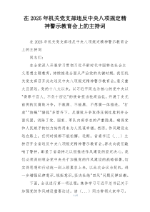 本次会议旨在深入学习中央八项规定精神,强化纪律意识,坚决反对四风,推动作风建设常态化。公文包网友为您分享整理的“在2025年机关党支部违反中央八项规定精神警示教育会上的主持词”范文资料,以供您参考学习之用,希望喜欢。