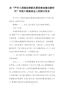 年轻干部应严守八项规定,树立新风,勇于担当使命,在新时代建功立业。下面是小编为您整理的在“严守八项规定树新风勇担使命建功新时代”年轻干部座谈会上的研讨发言范例,仅供参考,希望对您有所帮助。