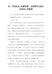 在这场充满温情与文化的盛会上,大家以饺为媒,传递爱心,展现了青年一代的团结与担当,真令人感动!下面是小编为您整理的在“以饺会友 用爱传情”五四青年公益文化活动上的致辞范例,仅供参考,希望对您有所帮助。