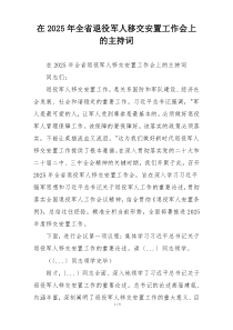 会议旨在总结退役军人安置经验,探讨未来工作方向,确保每位退役军人都能得到妥善安置,如何更好地实现这一目标?下面是网友整理编辑的在2025年全省退役军人移交安置工作会上的主持词相关范文,供大家参考学习,喜欢就下载支持!