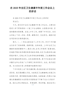会议强调加强公共卫生体系建设,提升医疗服务能力,推进健康教育普及,确保人民健康安全。公文包网友为您分享整理的“在2025年全区卫生健康半年度工作会议上的讲话”范文资料,以供您参考学习之用,希望喜欢。