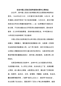 回顾历史铭记先烈英勇事迹,珍惜和平弘扬伟大抗战精神!下面是网友整理分享的纪念中国人民抗日战争胜利80周年心得体会精选样本合集相关资料,供大家学习参考,喜欢就分享吧!
