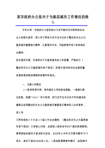 市政府办公室通过优化流程、减少会议文件、加强技术支持等措施有效减轻了基层工作负担。公文包网友为您分享整理的“某市政府办公室关于为基层减负工作情况的报告”范文资料,以供您参考学习之用,希望喜欢。
