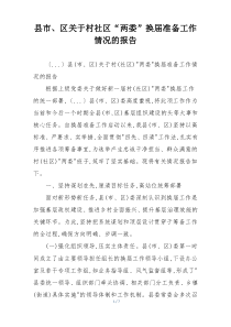 县市、区村社区“两委”换届准备工作有序进行,各项措施落实到位,确保选举顺利开展!以下是小编为您整理分享的“县市、区关于村社区“两委”换届准备工作情况的报告”相关内容,供您学习参考!