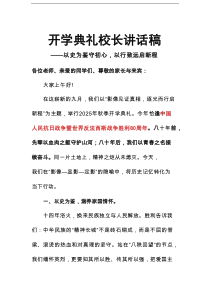 铭记历史,不忘初心,勇担使命,开创未来,以实际行动谱写新篇章。公文包网友为您分享整理的“2025秋开学典礼纪念抗日战争胜利80周年校长讲话稿:以史为鉴守初心,以行致远启新程”范文资料,以供您参考学习之用,希望喜欢。
