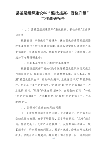 调研发现基层组织建设取得进展,但仍存问题需解决,如何进一步提升效能?公文包网友为您分享整理的“县基层组织建设年“整改提高、晋位升级”工作调研报告”范文资料,以供您参考学习之用,希望喜欢。