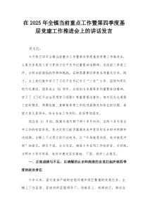 会议强调了加强基层党建、推动重点工作落实的重要性,要求各部门紧密配合,确保完成全年目标任务。下面是网友整理分享的在2025年全镇当前重点工作暨第四季度基层党建工作推进会上的讲话发言【整理】相关资料,供大家学习参考,喜欢就分享吧!