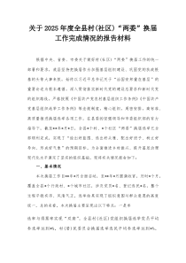 全县村“两委”换届工作顺利完成,新一届班子结构优化、活力增强,为乡村振兴奠定坚实基础。公文包网友为您分享整理的“关于2025年度全县村(社区)“两委”换届工作完成情况的报告材料【整理】”范文资料,以供您参考学习之用,希望喜欢。
