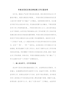 市商务局党支部积极开展品牌创建活动,强化组织建设,提升服务水平,增强党员凝聚力,推动工作创新。下面是网友整理编辑的市商务局党支部品牌创建工作汇报材料相关范文,供大家参考学习,喜欢就下载支持!