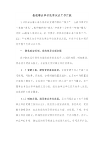 县级事业单位改革试点稳步推进,优化资源配置,提升服务效能,增强发展活力,取得初步成效。下面是小编为您整理的县级事业单位改革试点工作汇报范例,仅供参考,希望对您有所帮助。