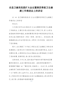 会议强调了卫生健康工作的重要性,部署了第四季度任务,要求各单位落实责任,推进项目进展,确保完成全年目标,如何有效执行?公文包网友为您分享整理的“在县卫健局党委扩大会议暨第四季度卫生健康工作推进会上的讲话”范文资料,以供您参考学习之用,希望喜欢。