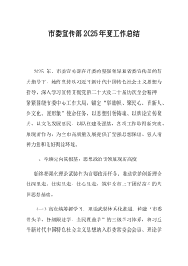 市委宣传部围绕中心工作,强化舆论引导,深化文化体制改革,提升城市文明形象,各项工作取得显著成效。下面是小编为您整理的市委宣传部2025年度工作总结(资料)范例,仅供参考,希望对您有所帮助。