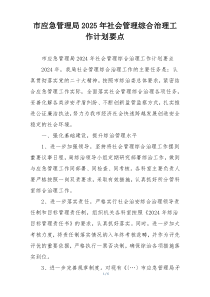 市应急管理局将加强风险防控体系建设,提升应急响应能力,推动社会共治共享,确保城市安全稳定。公文包网友为您分享整理的“市应急管理局2025年社会管理综合治理工作计划要点”范文资料,以供您参考学习之用,希望喜欢。