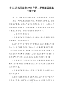 市XX局机关党委计划加强基层组织建设,深化党员教育,推进服务群众活动,提升党建工作实效,具体措施如何展开?以下由网友整理分享的市XX局机关党委2025年第二季度基层党建工作计划相关文档,供您学习参考,喜欢就分享吧!