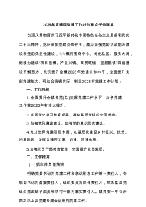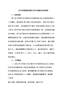 加强理论武装,推进组织建设,提升服务效能,强化作风纪律,如何确保各项任务落实到位?以下由网友整理分享的“2025年度基层党建工作计划重点任务清单范文(最新6篇)”相关材料,便您学习参考,喜欢就分享给朋友吧!