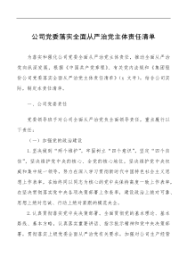 公司党委需明确全面从严治党责任,包括领导班子、党委书记及成员个人职责,确保措施到位,如何有效推进?公文包网友为您分享整理的“要点清单公司党委落实全面从严治党主体责任清单范文含党委班子党委书记班子成员个人集团国有企业国企”范文资料,以供您参考学习之用,希望喜欢。