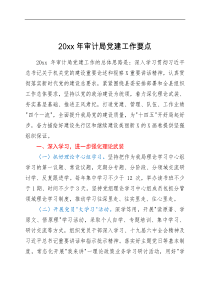 强化理论学习 加强组织建设 提升队伍素质 严格纪律要求 助力审计工作新发展 好振奋人心啊!下面是网友整理编辑的要点计划20XX年审计局党建工作要点相关范文,供大家参考学习,喜欢就下载支持!