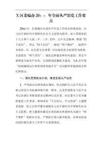 加强政治建设,严肃党内政治生活,深化党风廉政建设,强化监督执纪问责,提升党建工作质量。下面是网友整理编辑的某区委编办20XX年全面从严治党工作要点相关范文,供大家参考学习,喜欢就下载支持!