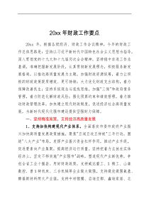 加强财政收支管理,优化支出结构,强化预算执行监督,推进财税体制改革,防范化解债务风险。下面是网友整理分享的思路要点20XX年财政工作要点相关资料,供大家学习参考,喜欢就分享吧!