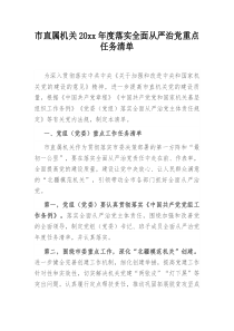 市直属机关强化政治建设,压实主体责任,深化作风建设,严肃党内纪律,加强监督执纪!公文包网友为您分享整理的“市直属机关20XX年度落实全面从严治党重点任务清单”范文资料,以供您参考学习之用,希望喜欢。